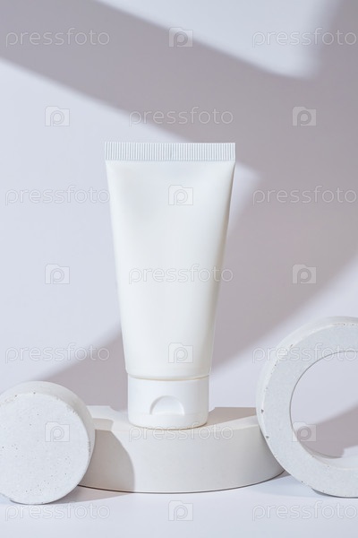 Белая косметическая трубка на белом фоне на белом бетонном подиуме. Концепция крема с натуральными ингредиентами, не тестируемого на животных