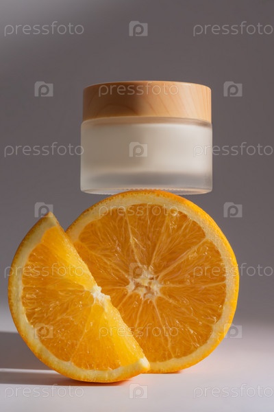 Крем с витамином С в банке из матового стекла на апельсины. Контейнер с косметическим продуктом для ухода за кожей, макияжем и концепцией женской красоты