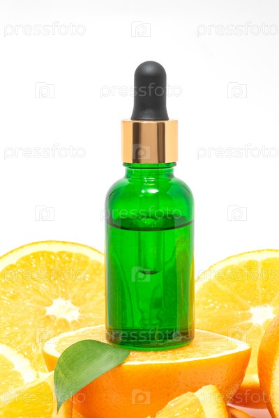 Бутылка сыворотки витамина С с разрезанными апельсинами на белом фоне. Макет рекламного плаката косметики