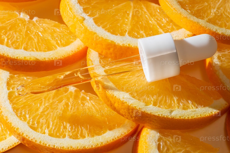 Крупный план сыворотки с витамином С в капле, окруженной свежими яркими дольками апельсина. макет