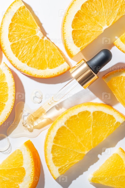 Пипетка для бутылок и жидкий желто-оранжевый ретинол или гель или сыворотка витамина С на белом фоне с нарезанными апельсинами