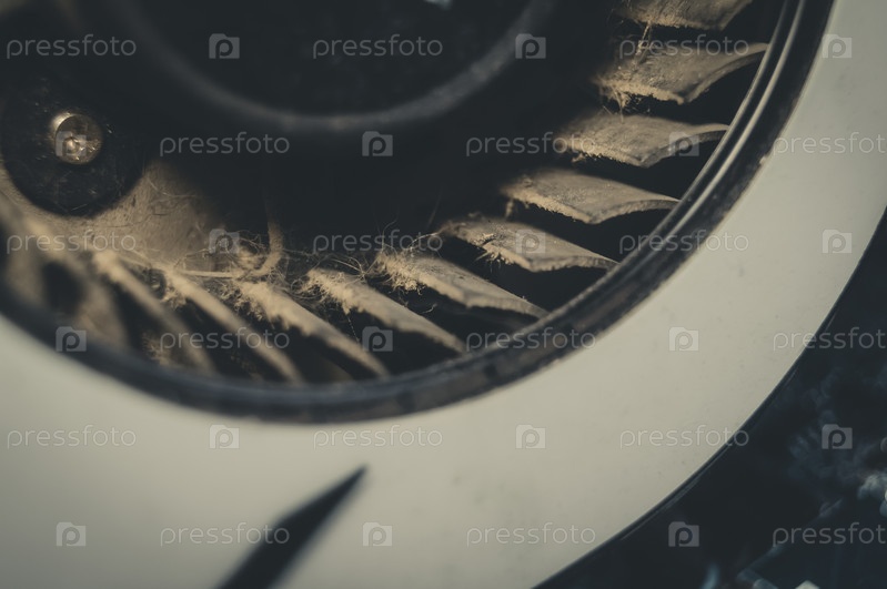 Покрытые пылью лопатки турбины системы охлаждения настольной видеокарты. Крупный план лопастей вентилятора системы охлаждения игровой видеокарты. Селективный фокус