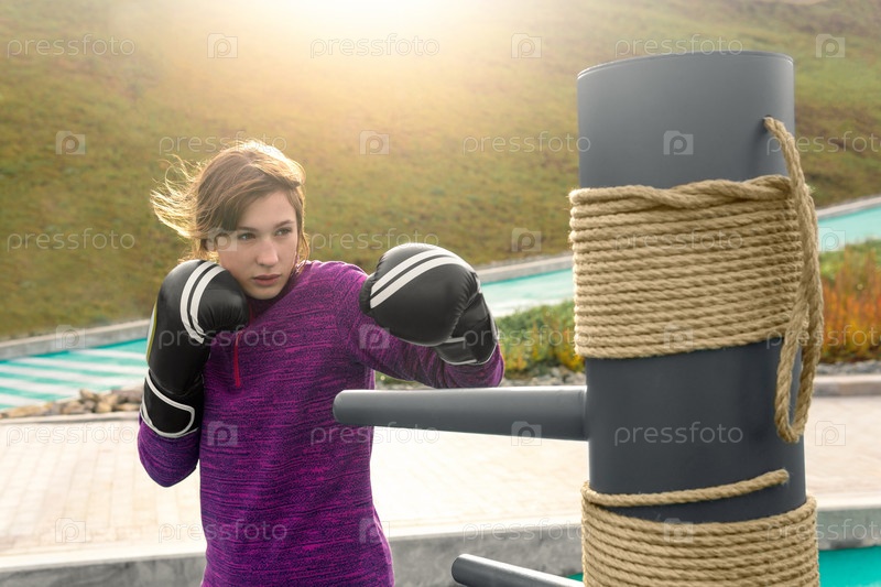 Молодая женщина тренируется в единоборствах одна на спортивной площадке с традиционными манекенами