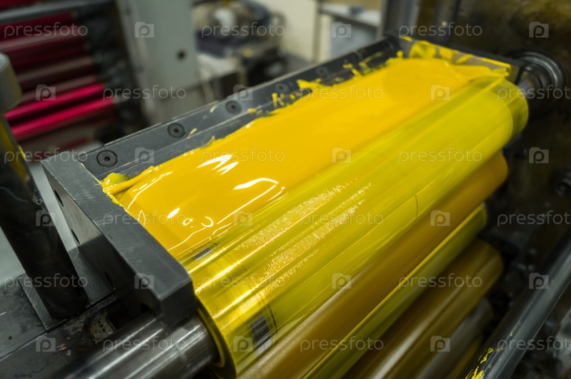 Желтые чернила в отсеке системы окраски современной флексографской печатной машины в типографии. Желтая краска в устройстве подачи чернил на печатном цилиндре. Селективный фокус