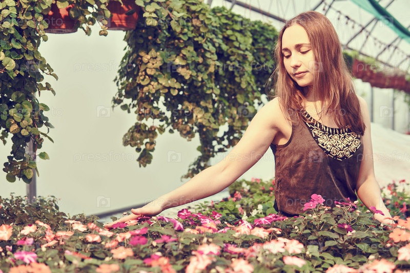 Молодая женщина с любовью трогает цветы в теплице