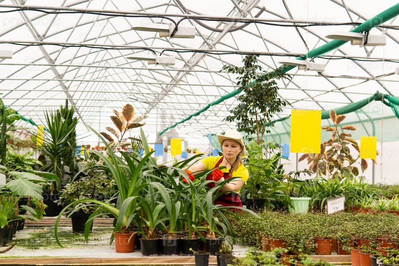 Женщина-флористка ухаживает за комнатными растениями в теплице