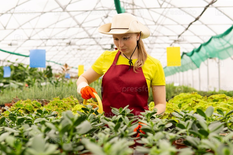 Женщина-флорист поливает комнатные растения в зимнем саду