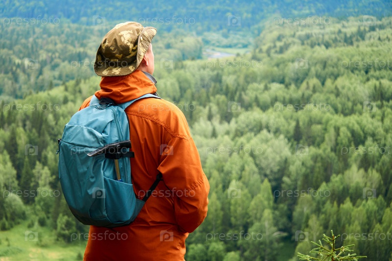 Мужчина-путешественник с рюкзаком смотрит вниз с горы на лесистую долину под ним