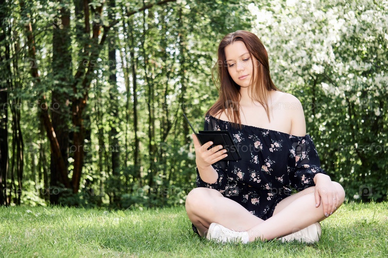 Девушка в платье сидит на траве и читает электронную книгу