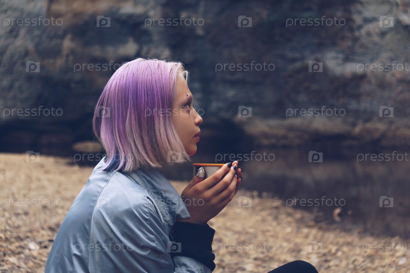 Портрет девочки-подростка-туристки, сидящей с кружкой на берегу реки и смотрящей на прибрежные скалы