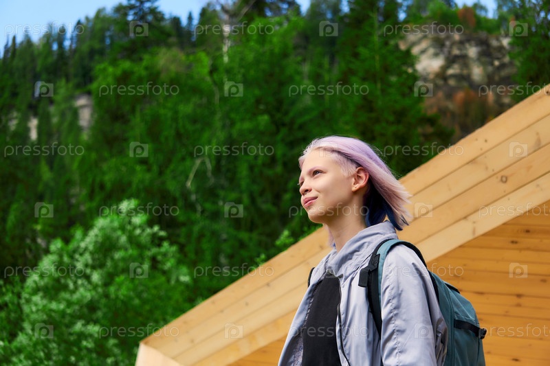 Портрет девочки-подростка с фиолетовыми волосами в парке