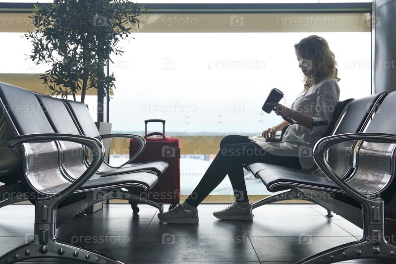 Женщина-путешественница с багажом сидит в зале ожидания аэропорта и ждет рейса