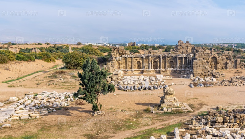 Вид на руины древнего города Сиде (ныне Манавгат, Турция) со зданием агоры на переднем плане