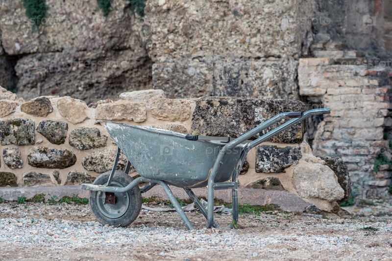 Использованная тачка на фоне древних стен на месте археологических раскопок