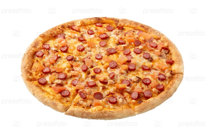 Вкусная классическая итальянская пицца с сосисками, курицей, перцем и сыром моцарелла. Свежая итальянская классическая оригинальная пицца на белом фоне