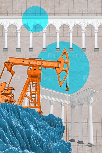 Классическая архитектура и промышленный масляный насос. Плакат с арт-концепцией, печать, обложка журнала. Сюрреалистический коллаж