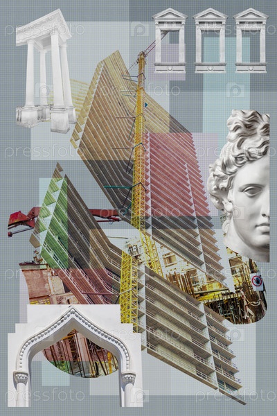 Смешанный промышленный фон современной и исторической архитектуры. Сюрреалистический арт-коллаж с элементами классических архитектурных деталей, античных статуй, фасадов новых зданий, строительных площадок