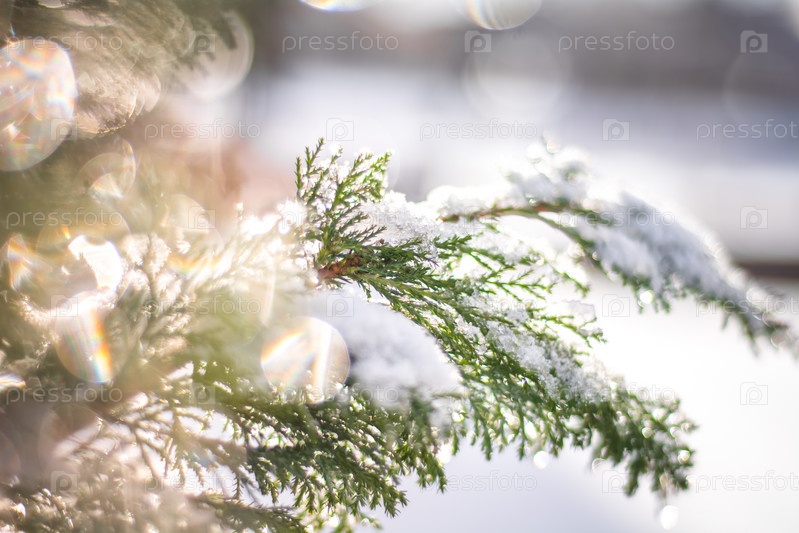 Снег на ветках елки тает под лучами весеннего солнца
