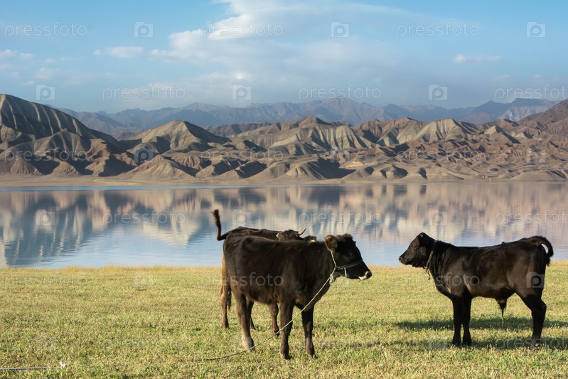 Токтогульское водохранилище Киргизия. Животные корова и теленок. Горное озеро на закате