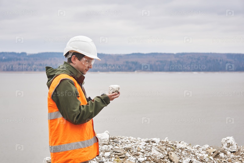 Геолог или горный инженер исследует образец минерала из осыпи на берегу реки