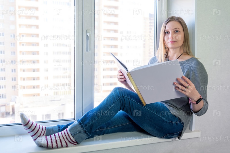 Женщина с фотокнигой в руках на подоконнике в помещении