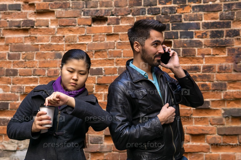 Молодой человек разговаривает по телефону, девушка скучает и жестикулирует в нетерпении