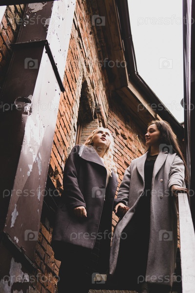 Две девушки на заднем дворе старого дома