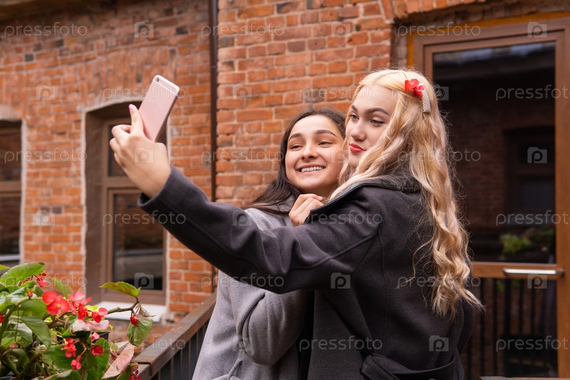 Две девушки делают селфи на фоне старого здания