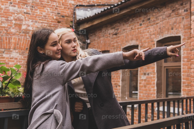 Две девушки во дворе старого дома что-то показывают друг другу