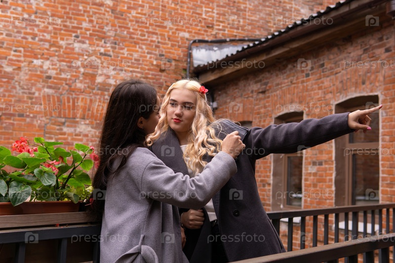 Две девушки во дворе старого дома что-то обсуждают и указывают в сторону
