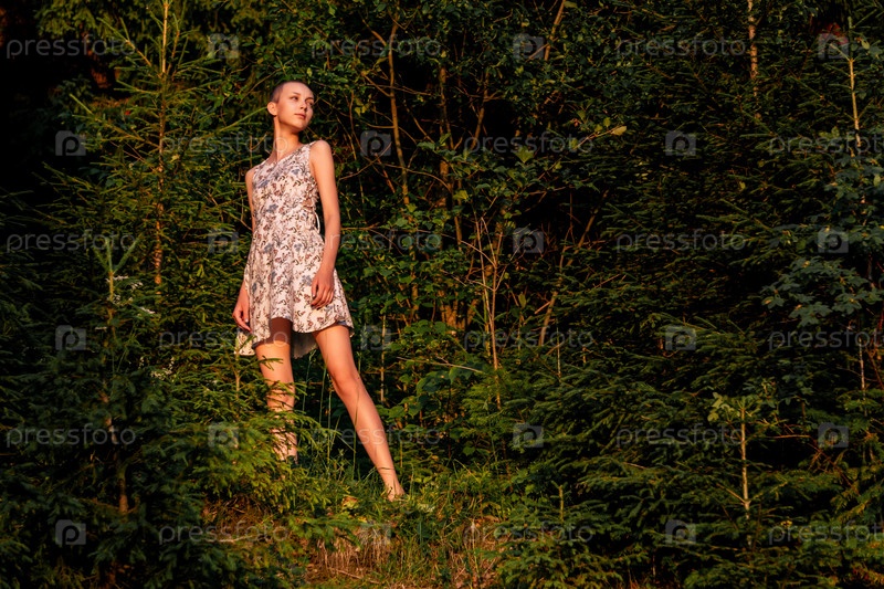 Девочка-подросток в летнем платье в лесу, освещенном лучами солнца