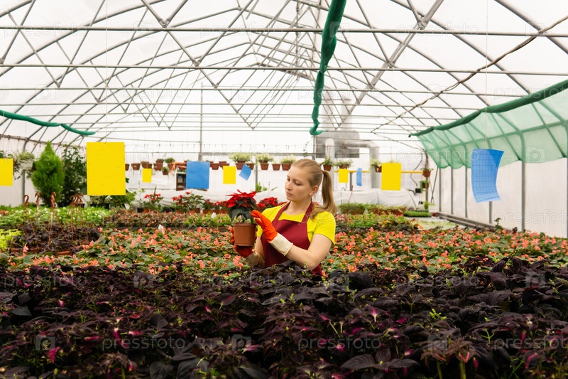 Женщина-садовник в теплице с комнатными растениями