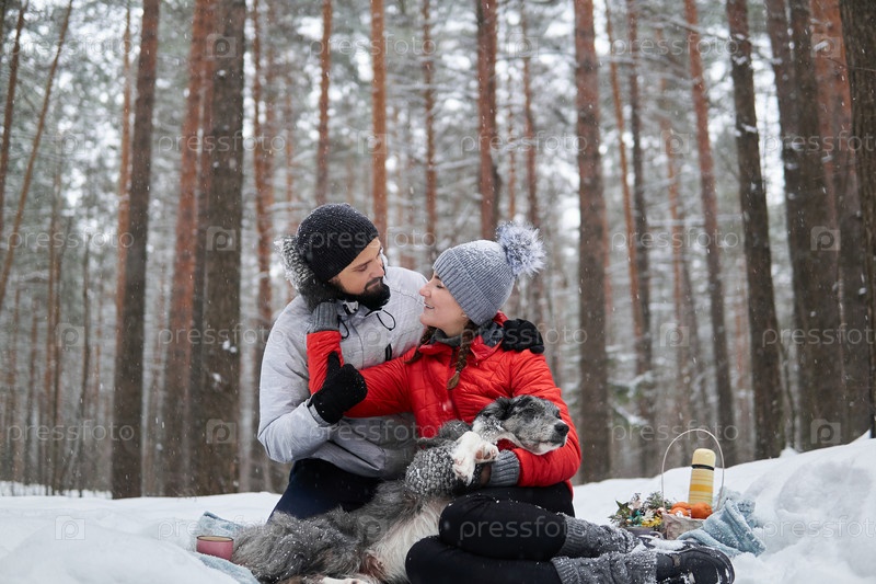 Молодая пара с собакой устраивают пикник в заснеженном лесу