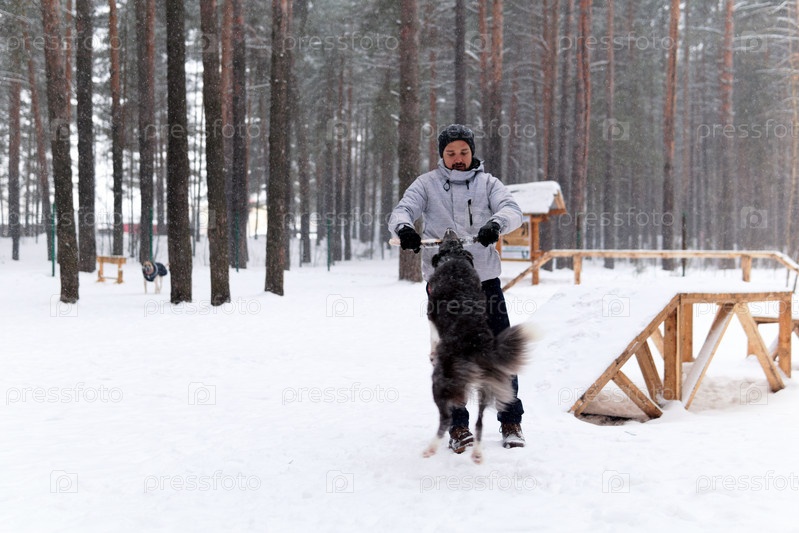 Молодой человек играет с собакой в собачьем парке в зимнем лесу