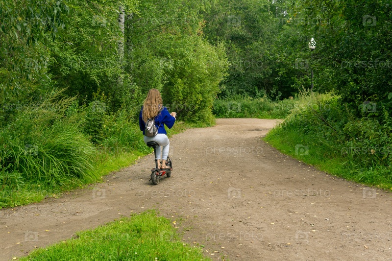 Молодая женщина едет на электросамокате по дорожке в парке