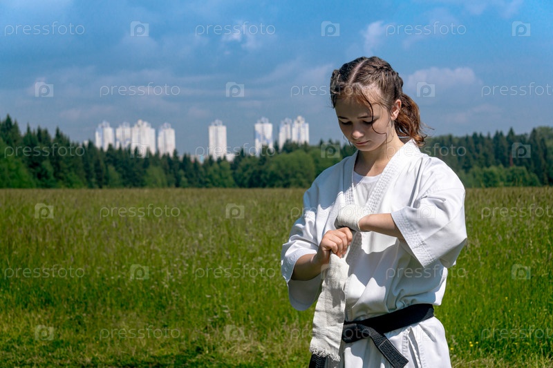 Девочка-подросток в кимоно обматывает руку повязкой перед занятием каратэ на свежем воздухе