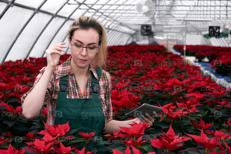 Женщина-агроном в теплице с цветущей пуансеттией работает с данными на электронном планшете
