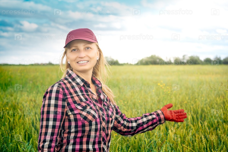 Улыбающаяся женщина, сельскохозяйственная работница, показывает рукой на поле