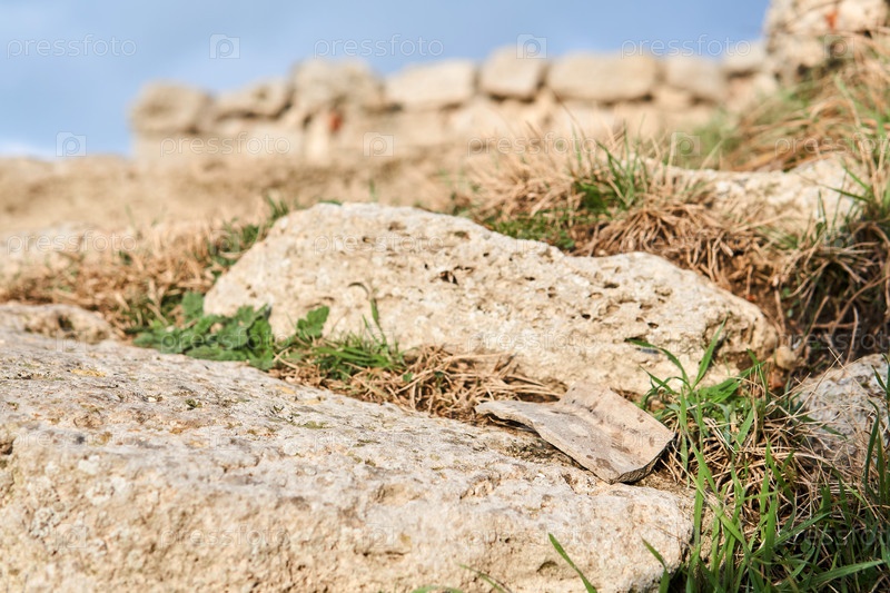 Осколок древней керамики на камне на фоне размытых древних руин