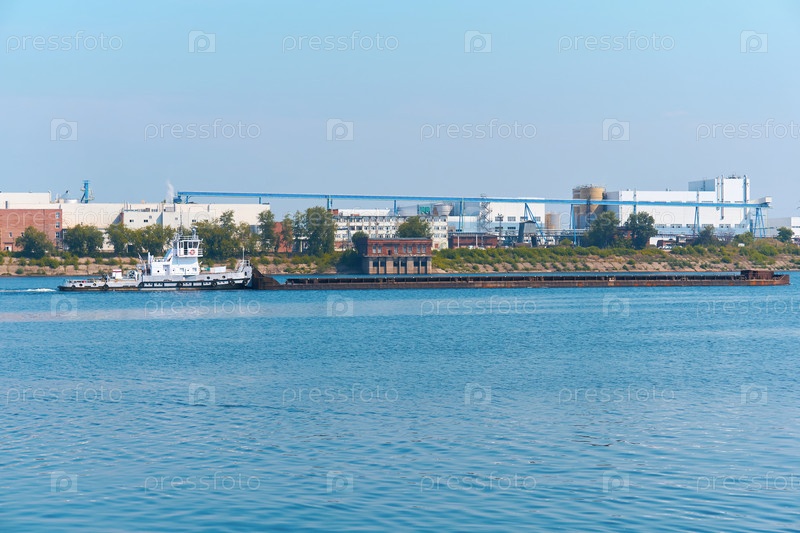 Буксир толкает баржу с сыпучими грузами по реке на фоне промышленного пейзажа на берегу
