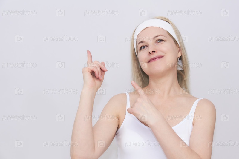Женщина средних лет в повязке для волос для косметических процедур указывает на место рядом с ней