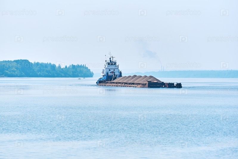 Буксир-толкач толкает баржу сухогрузов с песком по реке в утренней дымке