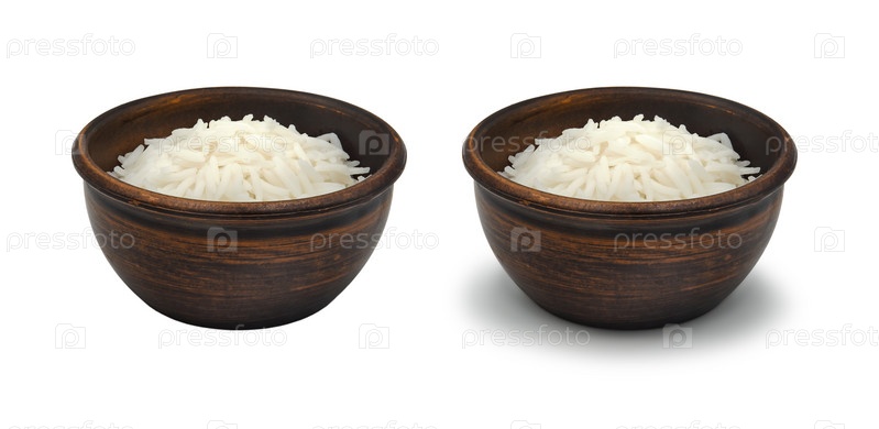 Вареный белый рис в глиняной миске на белом фоне, изолированный и с тенью