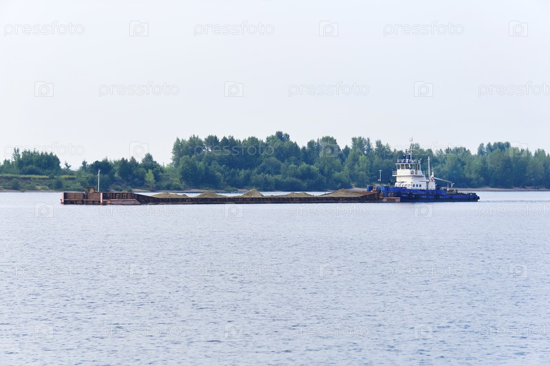 Буксир-толкач толкает по реке баржу насыпных грузов с песком