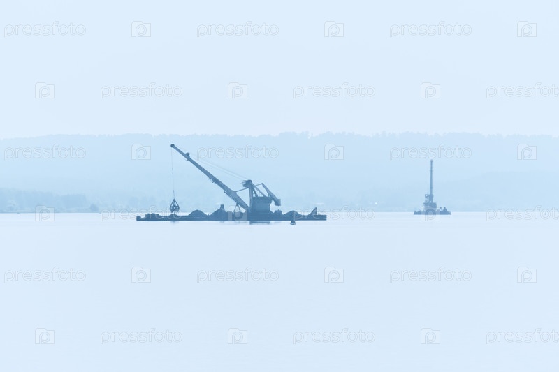 Земснаряды работают над углублением фарватера на реке в утреннем тумане
