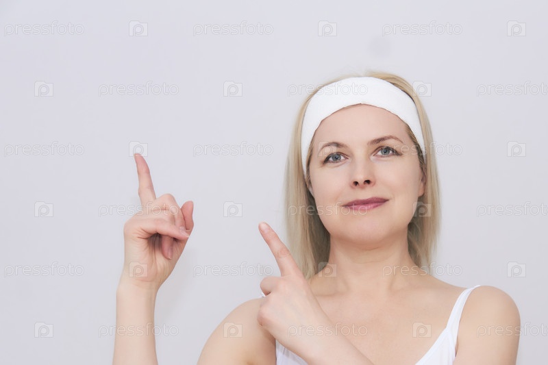 Женщина средних лет в повязке для волос для косметических процедур указывает на место рядом с ней