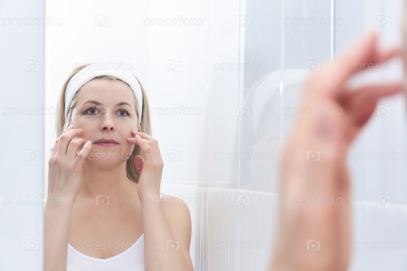 Женщина средних лет делает самомассаж лица вокруг глаз перед зеркалом