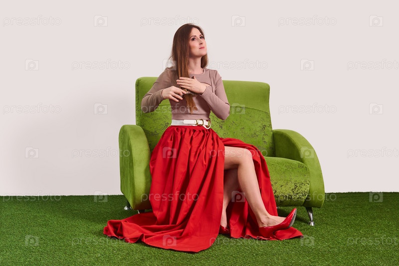Молодая женщина расчесывает свои длинные прямые волосы расческой, сидя на диване в студии