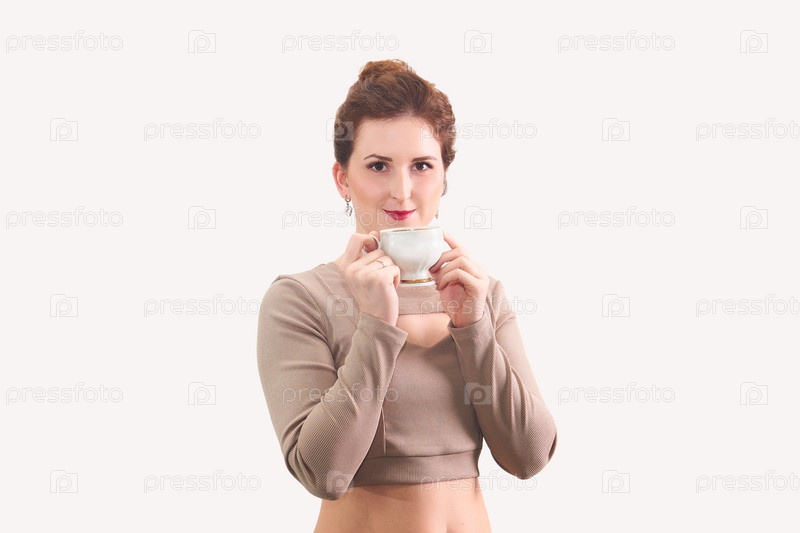 Молодая женщина с чашкой чая на белом фоне