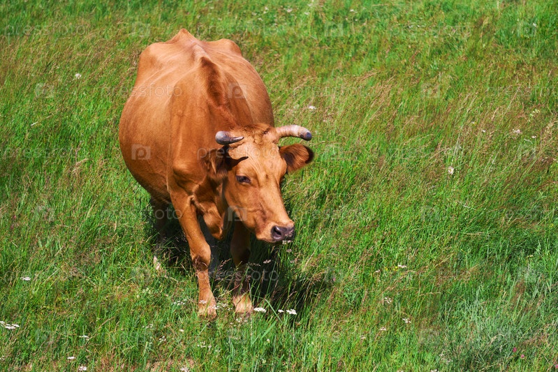 Рыжая корова среди травы на лугу